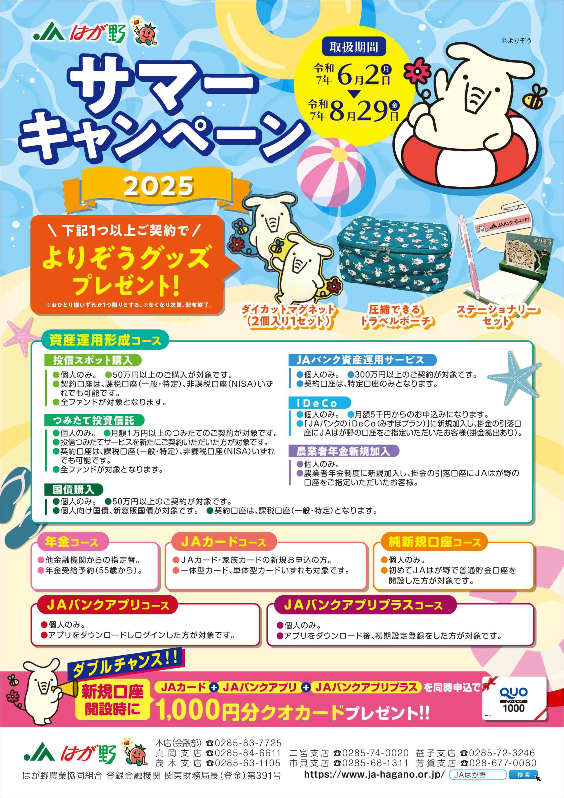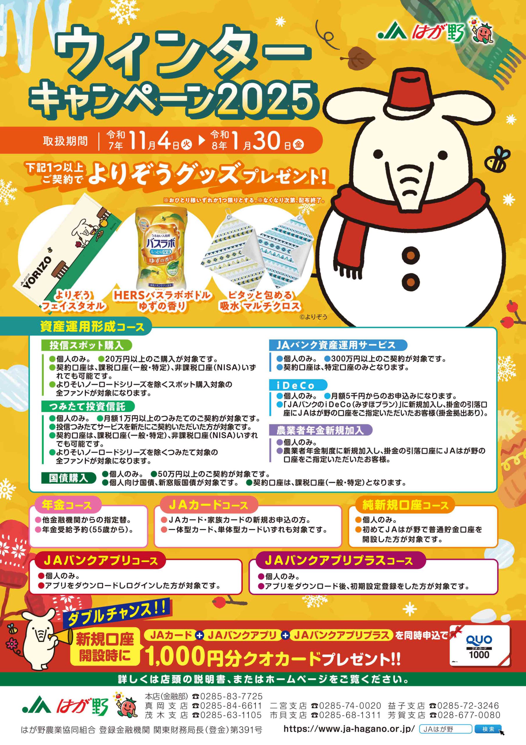 ☆★☆ウインターキャンペーン2025★☆★ 案内チラシはこちら(PDFファイルが開きます) ☆★☆JAバンク栃木「はじめるなら今!NISAスタートキャンペーン」★☆★ 案内チラシはこちら(PDFファイルが開きます) ☆★☆JAはが野 年金ご紹介特典!!★☆★ 案内チラシはこちら(PDFファイルが開きます) お知らせ一覧 HOME