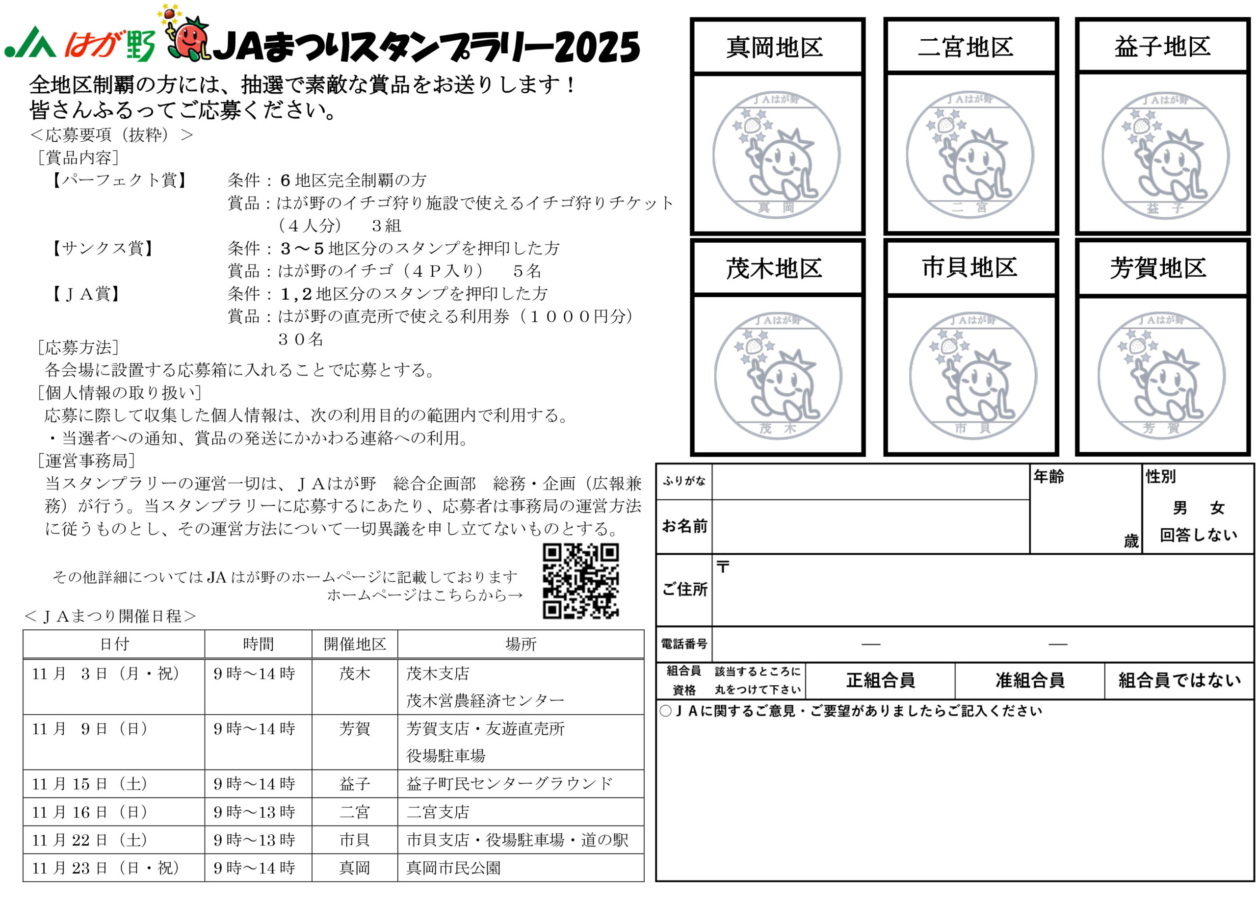 各地区の支店や直売所、JAまつり会場にスタンプと応募用紙を配置予定です。専用の応募用紙へ押印し、会場にある応募箱へ投函ください。