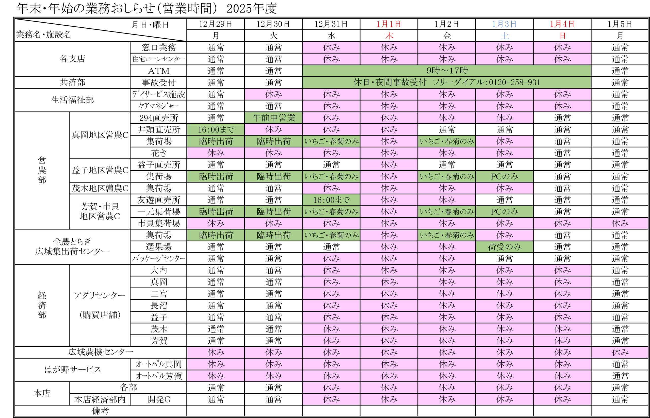 年末年始営業のお知らせ
