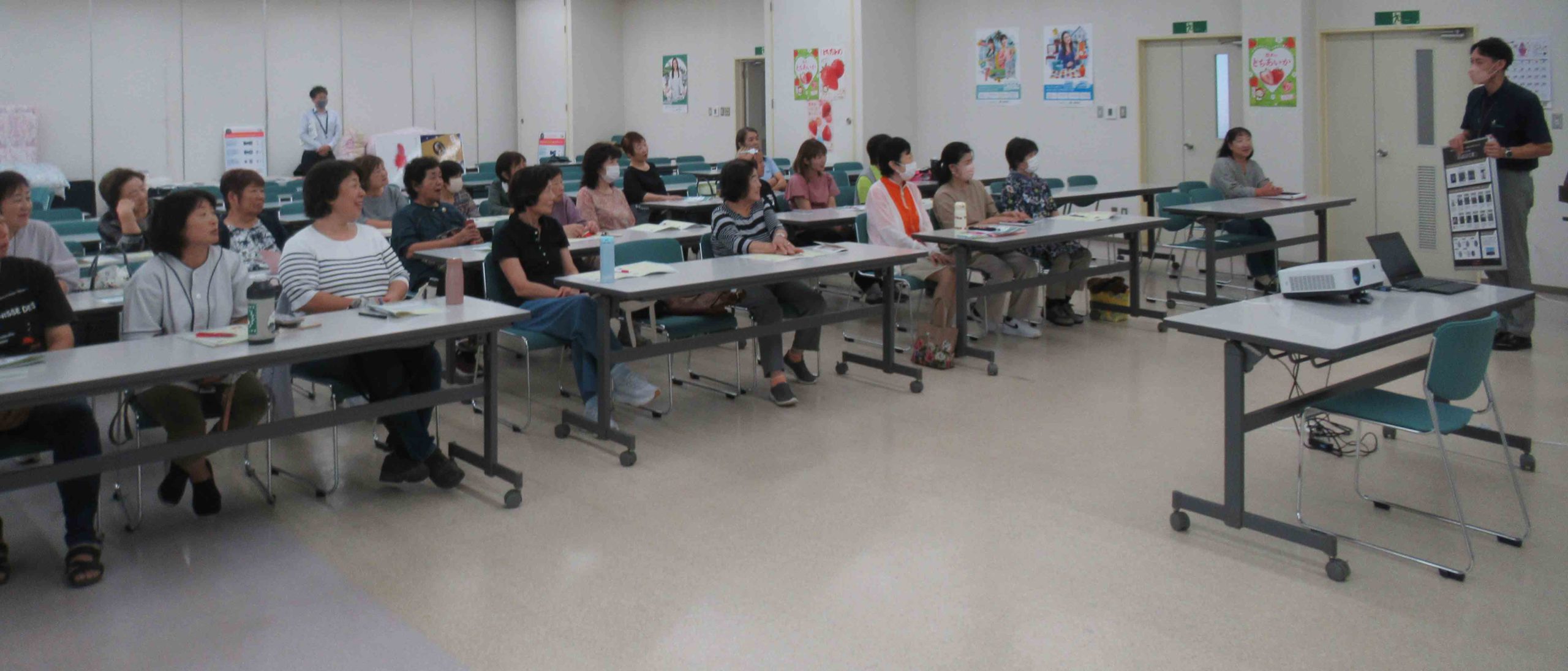 ●令和5年7月7日(金)、市貝地区女性会は「あれこれカレッジ」において、芳賀地区消防本部市貝分署のご協力により救急救命講習を開き、AED活用など応急手当を学びました。あわせて会員である永嶋さんの指導によりオレオレ詐欺撲滅音頭の練習を行い、特殊詐欺撲滅や防犯意識啓発に役立てます。