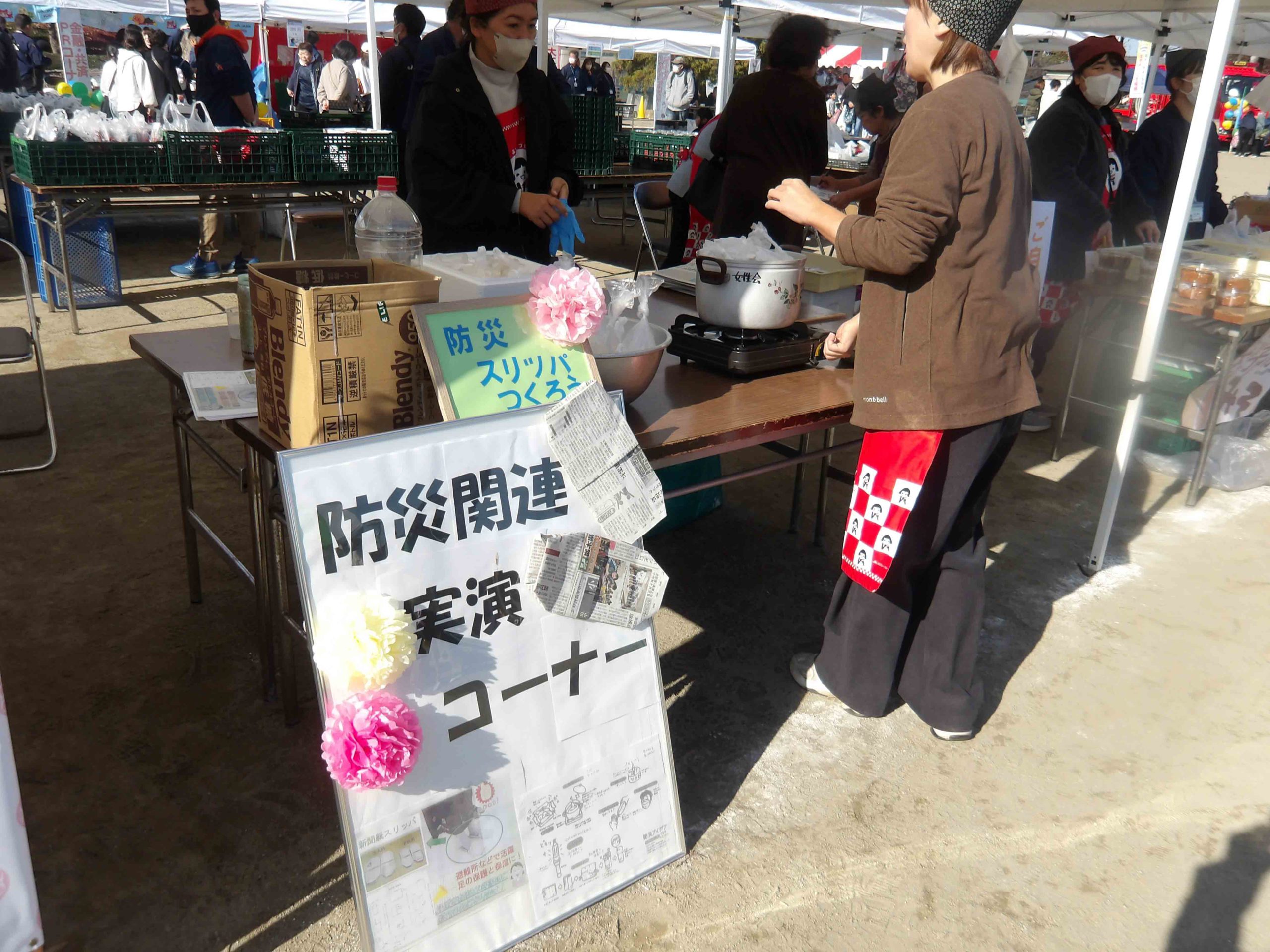●令和7年11月15日(土)、益子地区女性会は、益子地区JAまつりに参加しました。加工部会の手作り食品販売、フードバンクへの提供品受付も行いました。また地域の皆さんが災害について考えるきっかけになればと思い、防災関連実演コーナーも設け、新聞紙スリッパつくり、ポリ袋に入れて湯せんで炊いたご飯の試食も行いました。