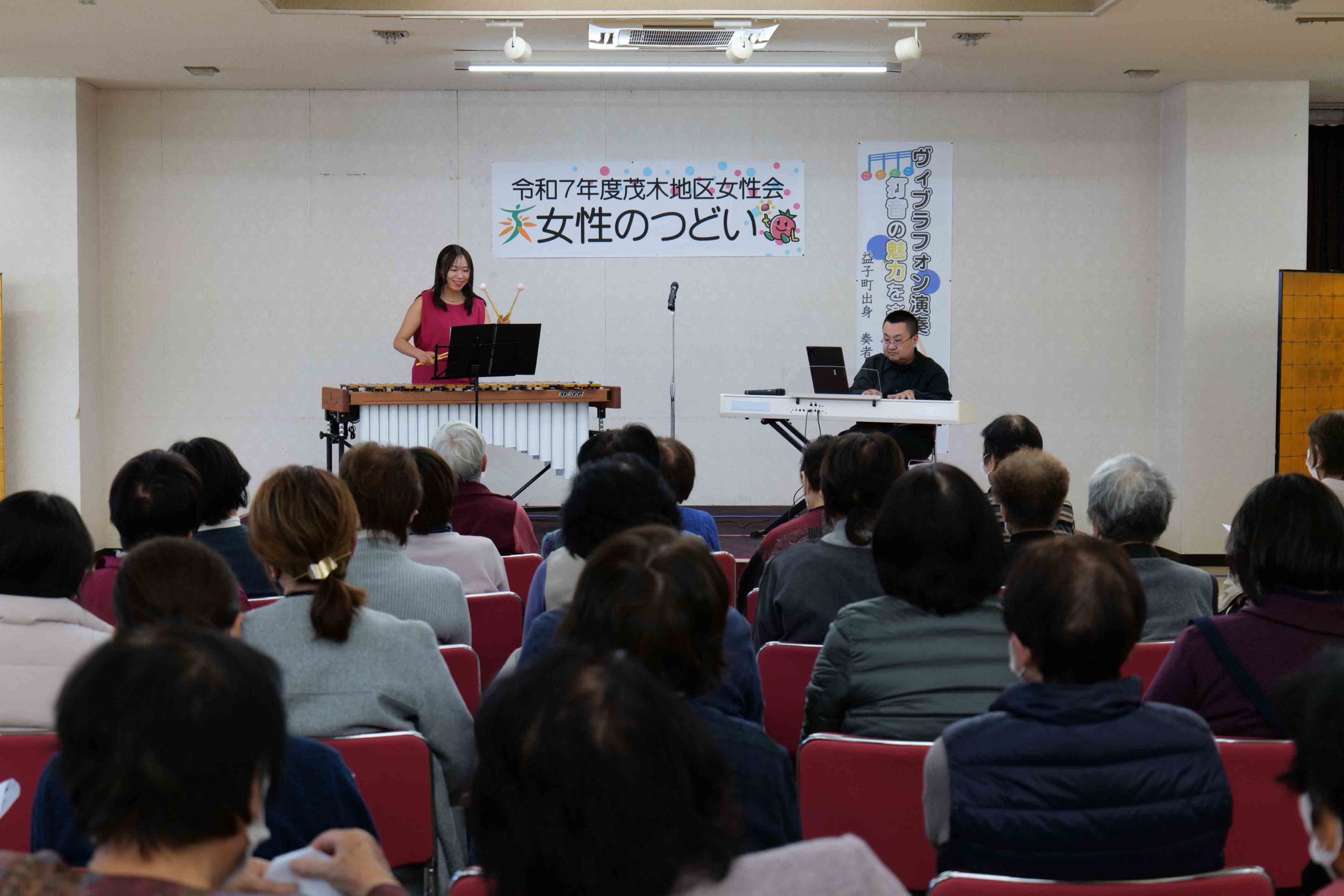 ●令和7年11月29日(土)、茂木地区女性会は「女性のつどい」を開催。高島聡美さんによるヴィブラフォン(=鉄琴の仲間)演奏を楽しみました。子守歌からポップス、アンコール曲など邦楽洋楽問わず、音符が踊りだしているようでした。またビンゴゲームでのワクワク・ドキドキ感もあり盛り上がりました。